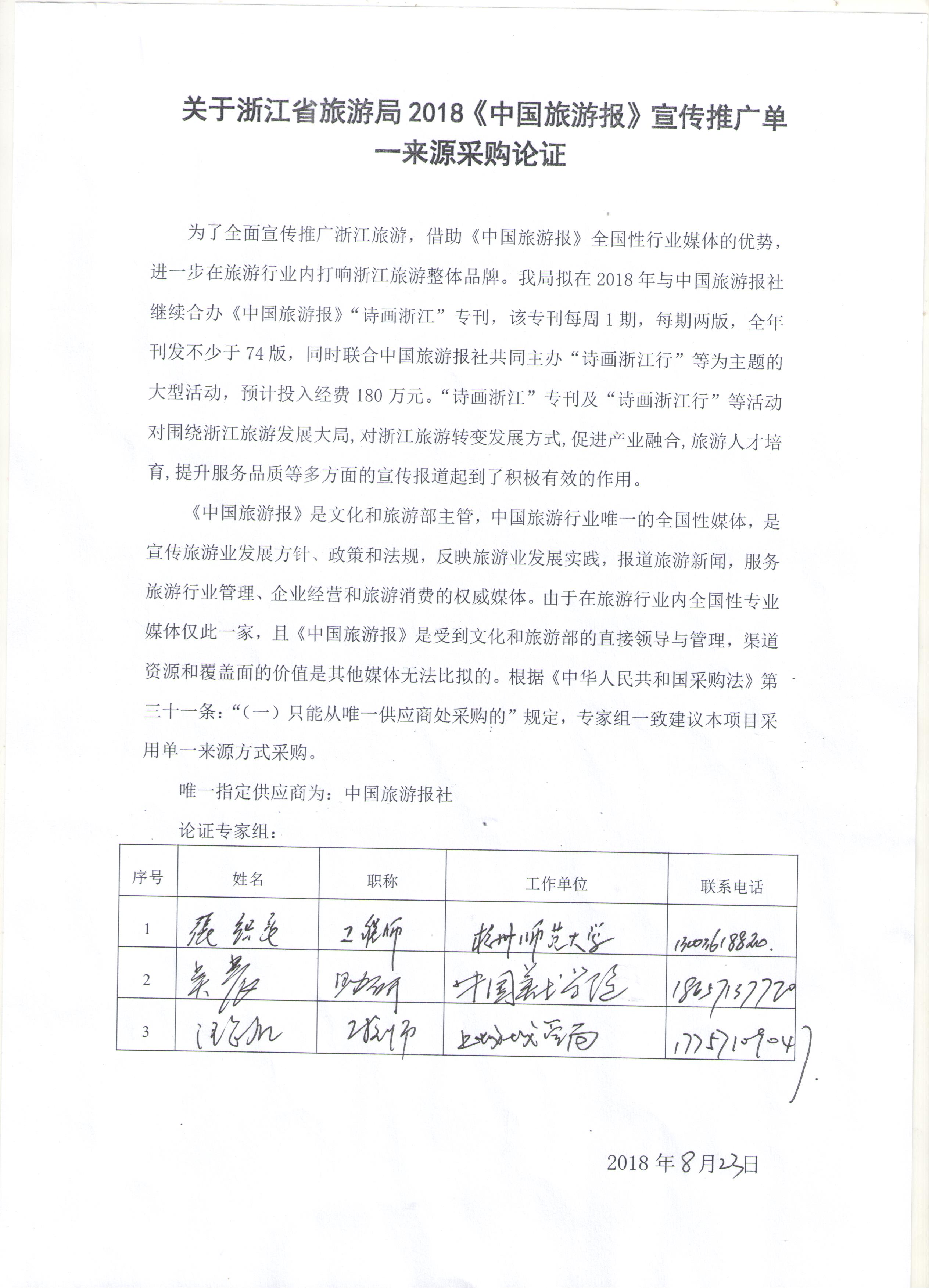 《中国旅游报》是文化和旅游部主管,中国旅游行业唯一的全国性媒体,是宣传旅游业发展方针、政策和法规,反映旅游业发展实践,报道旅游新闻,服务旅游行业管理、企业经营和旅游消费的权威媒体。由于在旅游行业内全国性专业媒体仅此一家,且《中国旅游报》是受到文化和旅游部的直接领导与管理,渠道资源和覆盖面的价值是其他媒体无法比拟的。根据《中华人民共和国采购法》第三十一条:“(一)只能从唯一供应商处采购的”规定,专家组一致建议本项目采用单一来源方式采购。